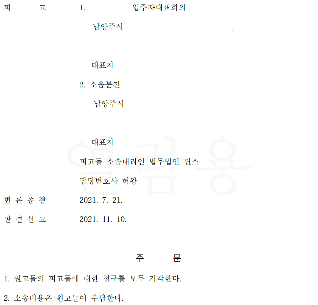 돈을 더 내어놓으라며 소송을 하였던 일부 입주자들의 공격을 방어하는 데에 성공한 사건입니다.