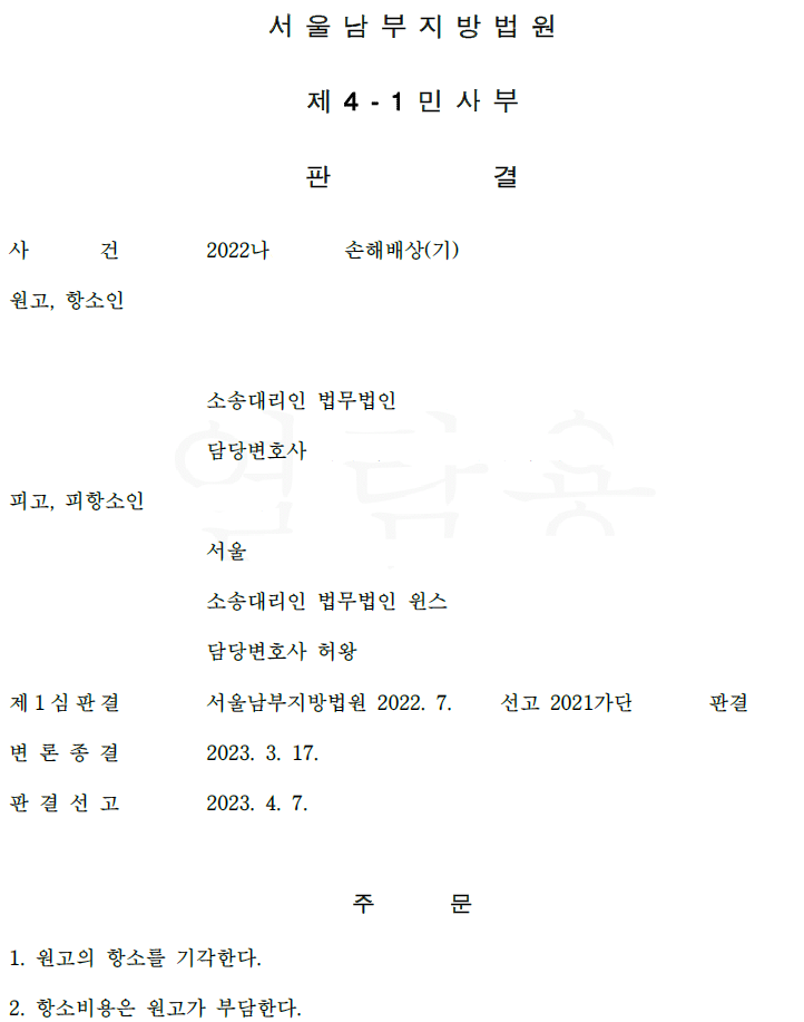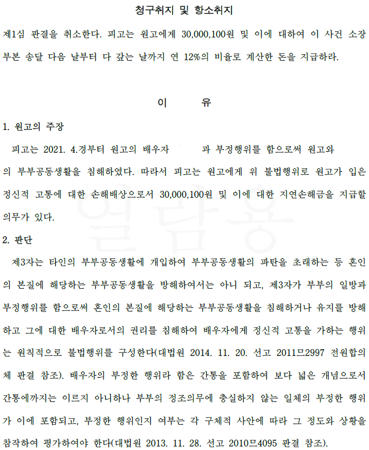 이번 사건은 남편이 바람이 났다며 바람이 난 상대방 여자에 대하여 소를 제기한 사건에서 청구기각을 받은 사건입니다. 1심에서 청구기각이 난 사건을 항소심에서 받아서 그 청구기각을 유지하였던 사건입니다.